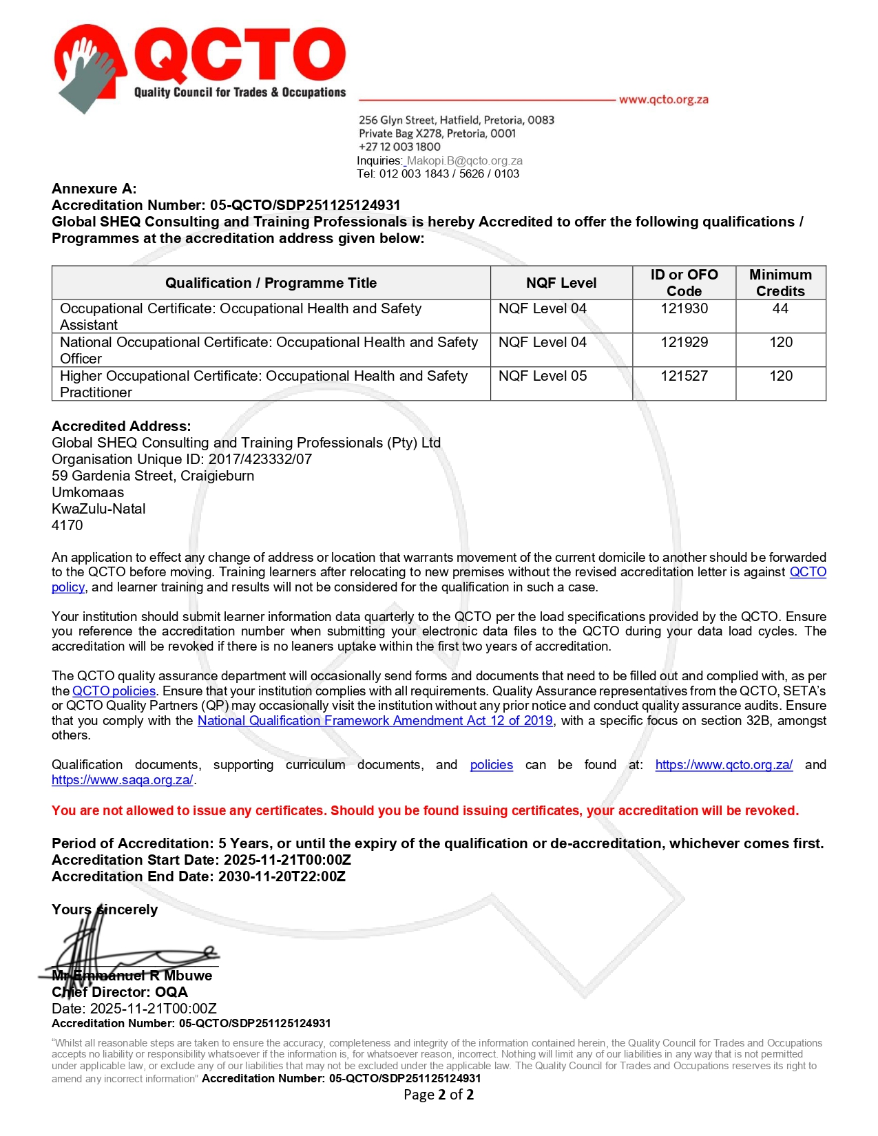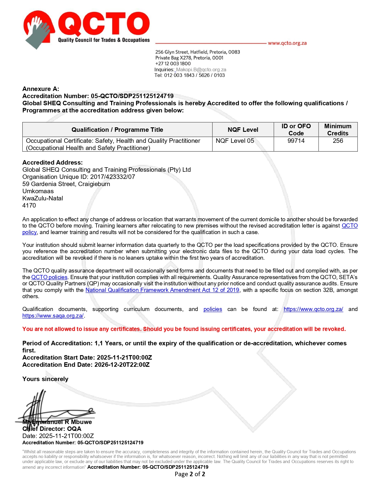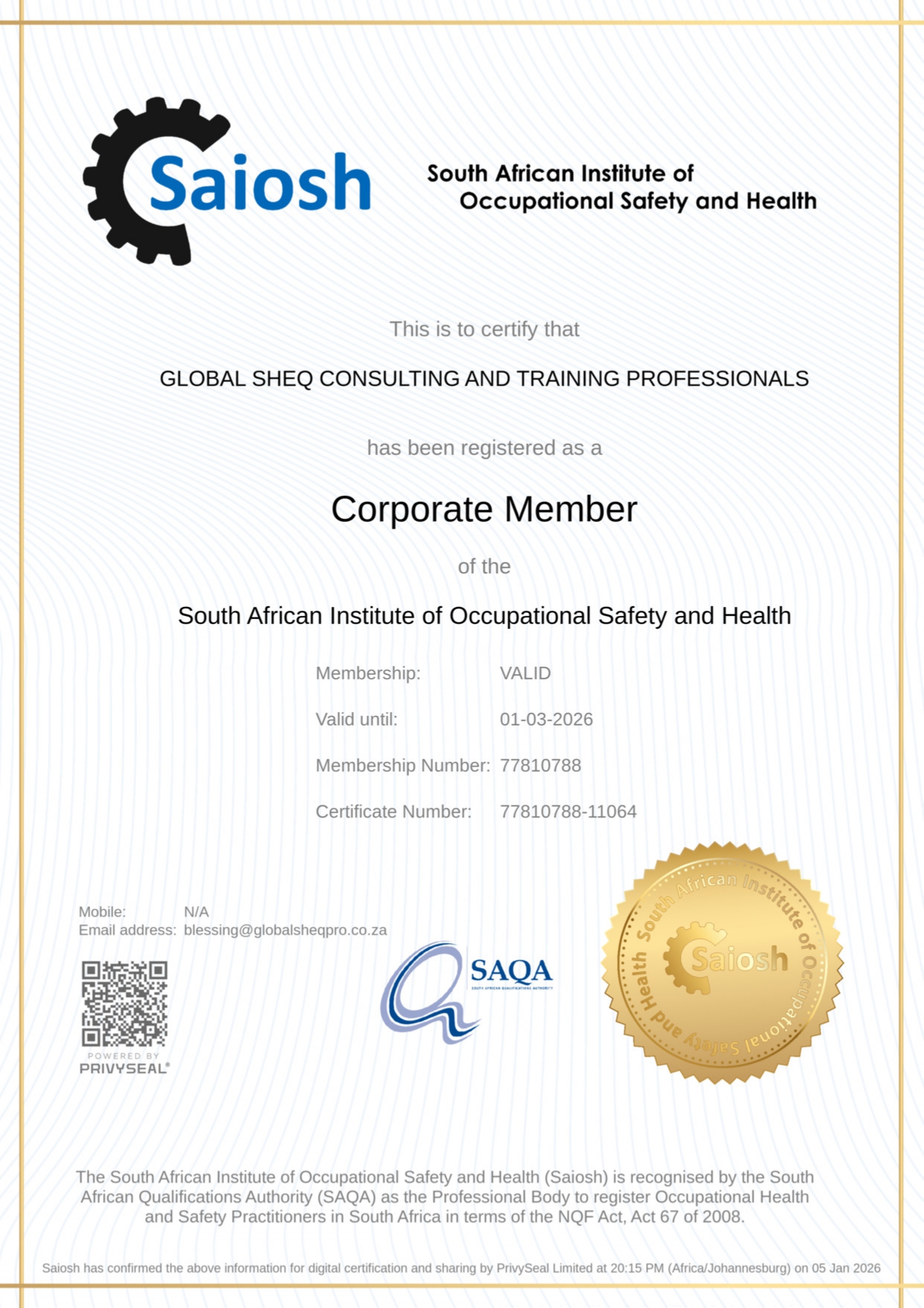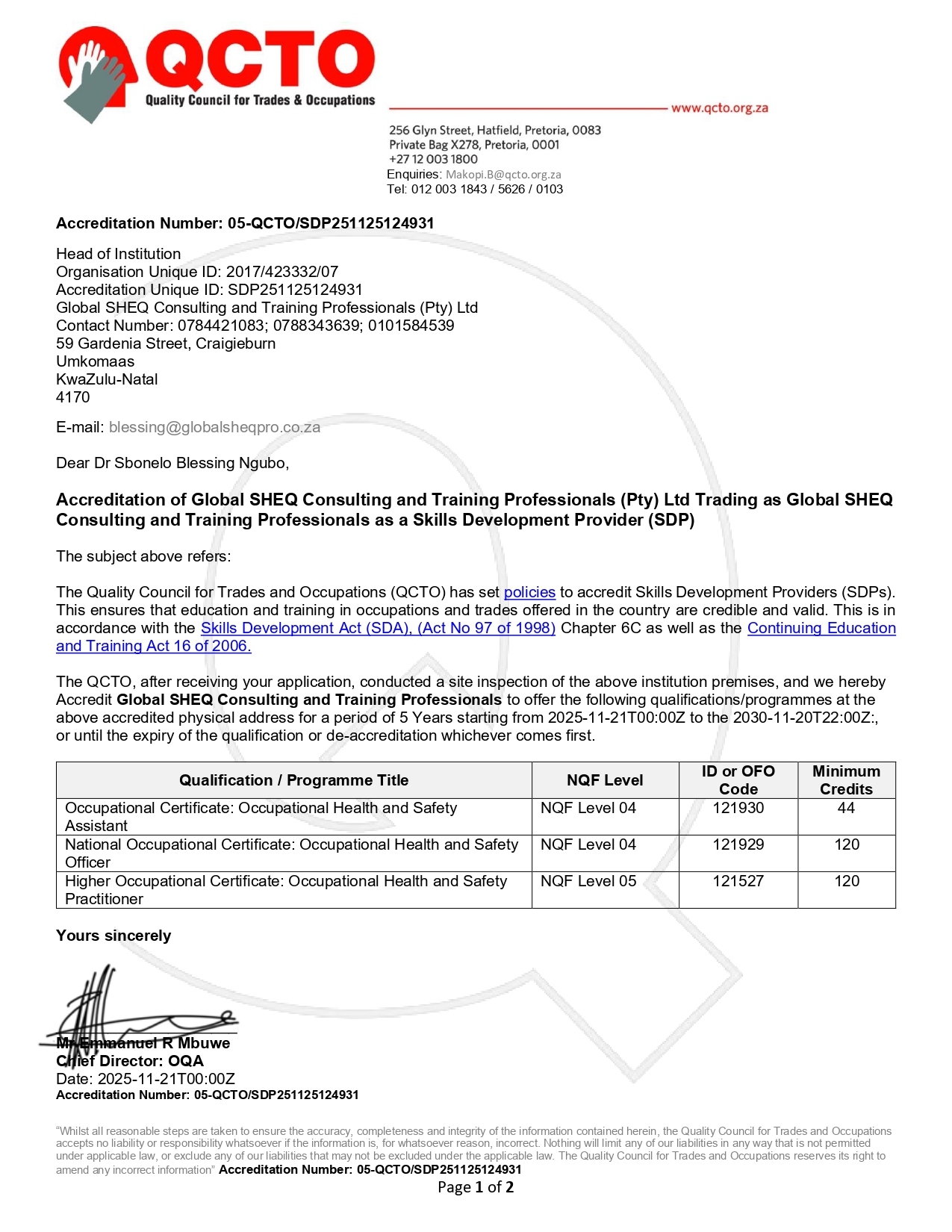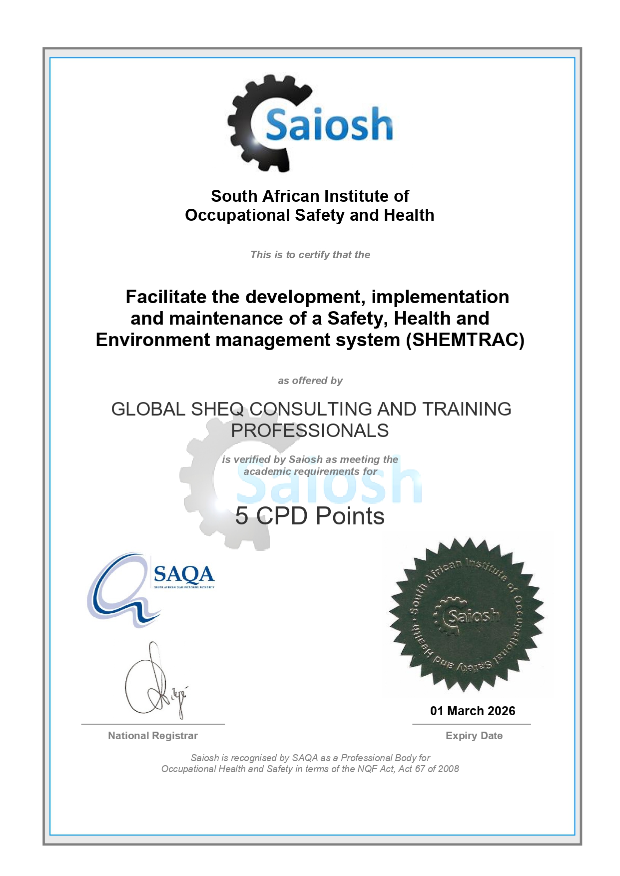 Our comprehensive range of courses includes short courses ranging from 1 day to 2 years. we have soft skills and technical skills. We offer our courses through classroom-based learning and interactive online learning via our approved online learner management system. We offer more than 70 courses, accredited by QCTO, and SAIOSH and 30 non-accredited or non credit bearing course but which assist with knowledge and awareness and industry recommended.